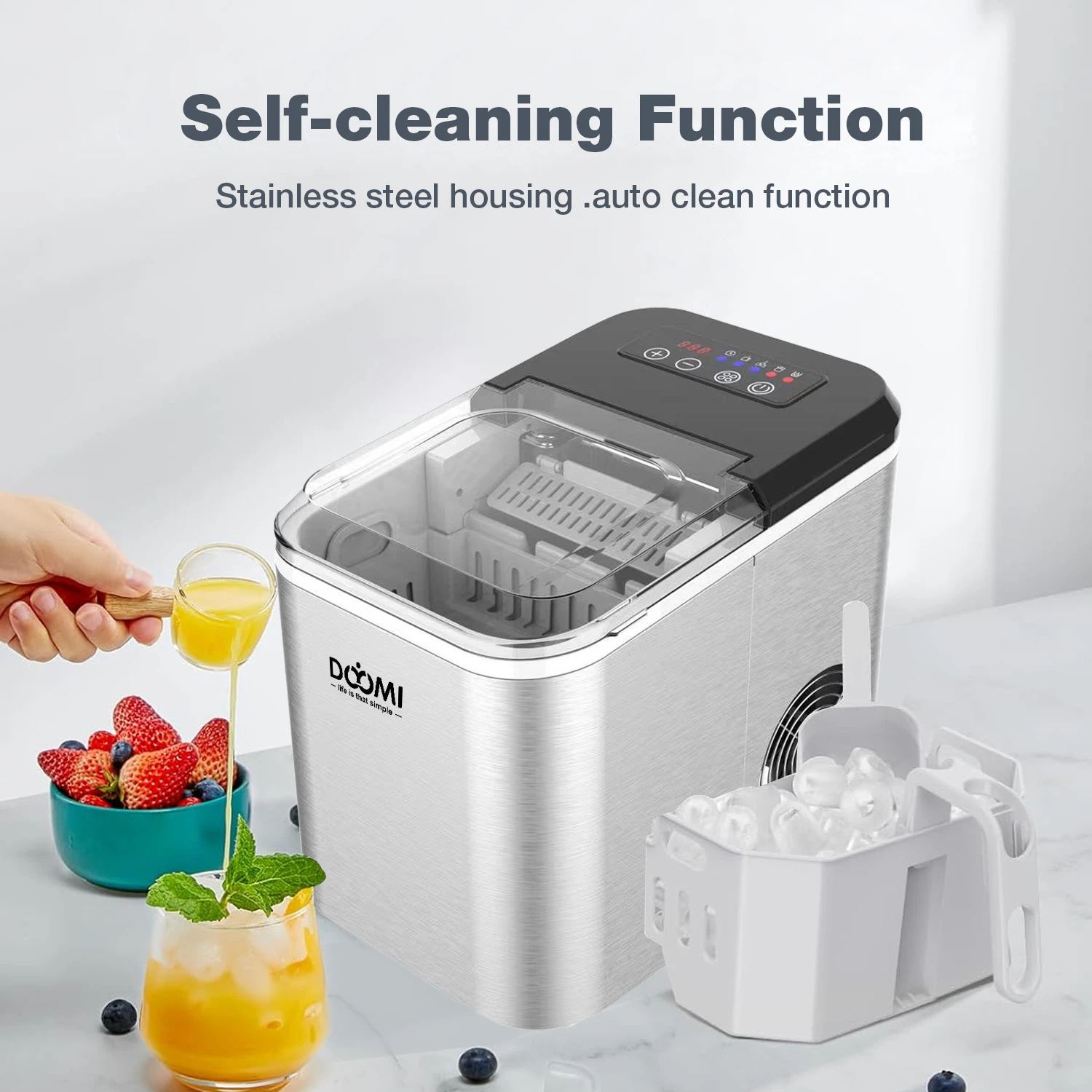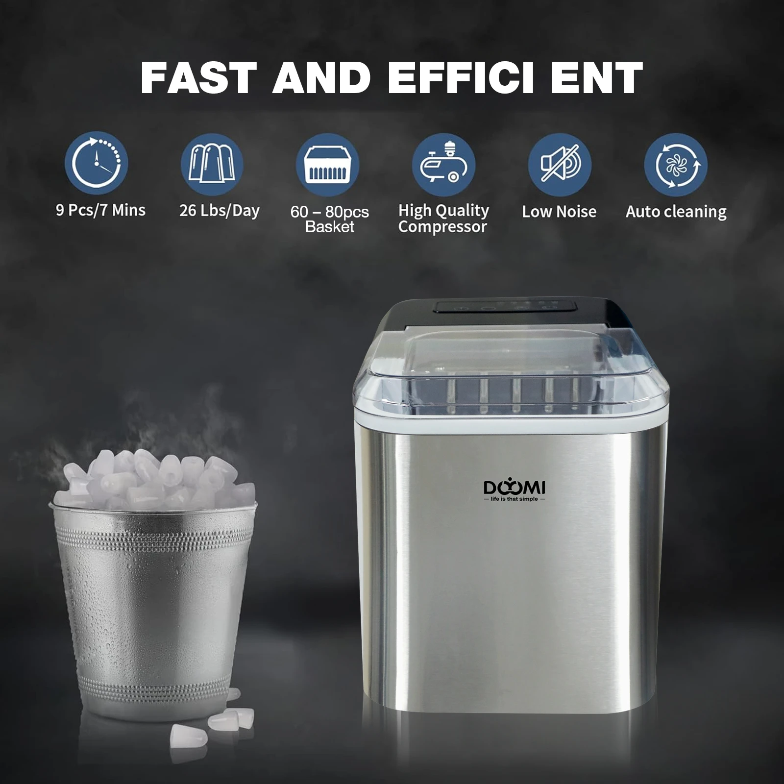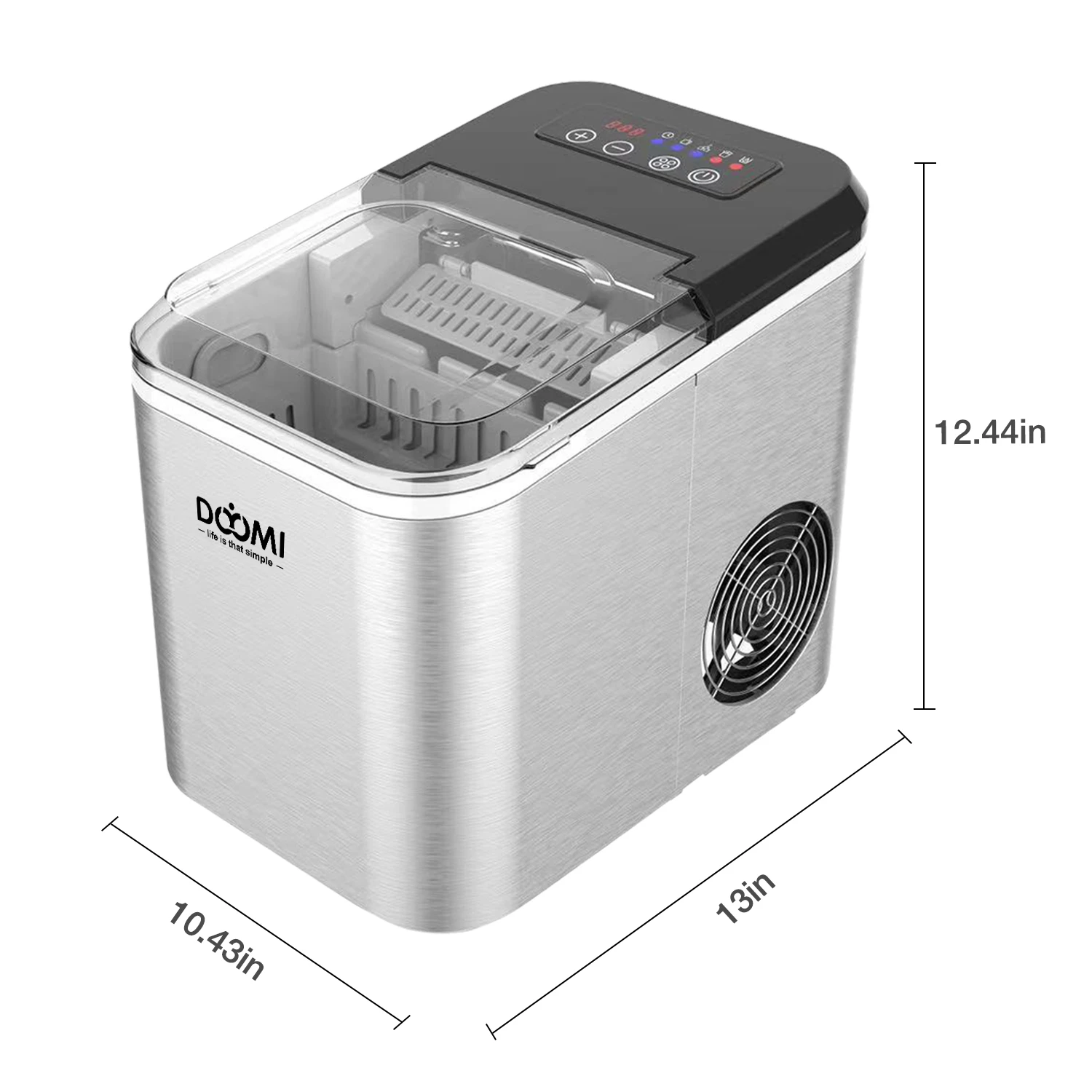 DOYOMI Countertop Ice Maker, 9 Cubes Ready in 6 Mins,, Self-Cleaning Ice Machine With Ice Scoop And Basket, 2 Sizes Of Bullet Ice for Home Kitchen Office Bar Party, Timed Ice Making, Brushed Silver